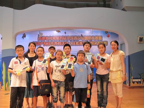 胜西小学继去年成功协助青羊区教育局举行了第三届中国青少年创意大赛成都青羊赛区现场选拔赛,在比赛中以小学组总分第一荣获团体一等奖后。今年又组队参加了在 泡桐树小学西区体育馆举行的第四届中国青少年创意大赛成都青羊赛区现场选拔赛,参赛的十名孩子,在“太阳能小车创意拼装设计”和“太阳能小车竞速比赛”均 发挥出色,再次以总分第一的好成绩荣获团体一等奖。参赛的同学如下:何毅韬、陈秋雨、黎钧天、李济良、杨帅、张栩霖、王裕安、茅傲岳、姚思舟、杨小昊。