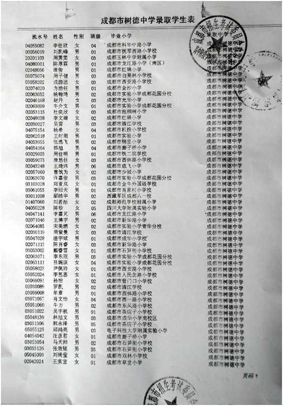2011年成都树德中学录取学生名单