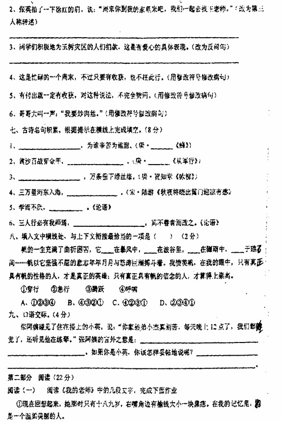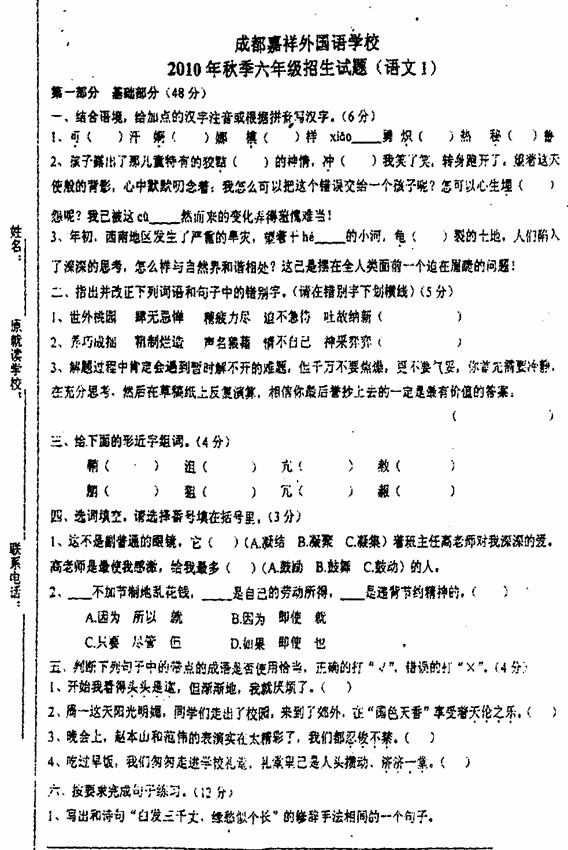 成都嘉祥外国语学校2010年秋季六年级招生语文试题