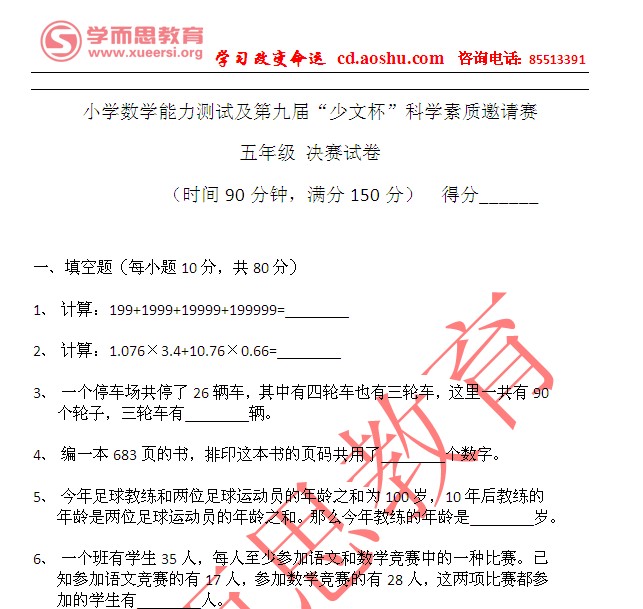 第九届"少文杯"邀请赛五年级决赛试卷 成都市青少年宫 2011-10-13 11:05:51 小学数学能力测试及第九届"少文杯"科学素质邀请赛五年级决赛试卷 请下载附件: 《第九届"少文杯"邀请赛五年级决赛试卷》 本地下载 点击查看:第九届"少文杯"邀请赛五年级决赛试卷详解 推荐阅读: 第九届"少文杯"邀请赛四年级决赛试卷 2010年第十届少文杯获奖分数部分统计 第十届"少文杯"数学邀请赛五年级试题