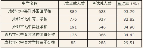 备注:成都市七中实验学校在上表中的数据不含直升生。加上60名直升生,重点率应该是41%。“直升生60名”该数据来源于2010年官方招生计划中的备注。