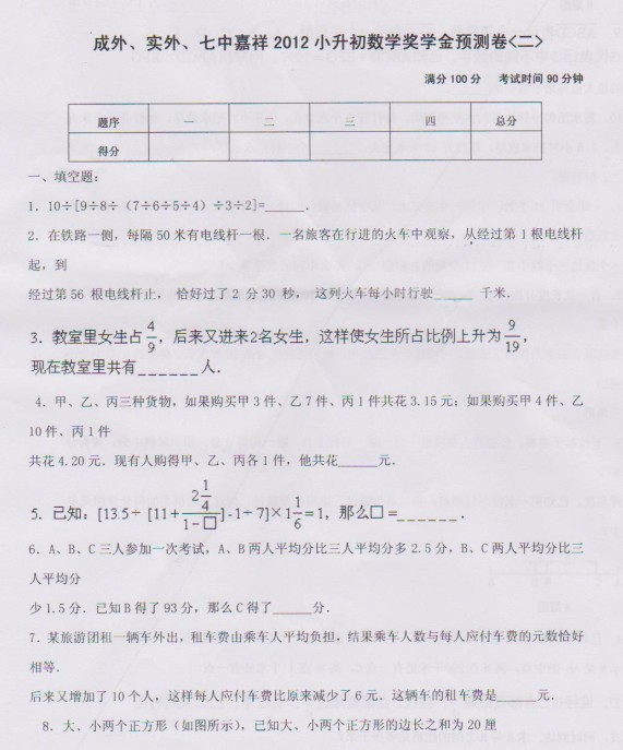 成外、实外、七中嘉祥2012小升初数学奖学金预测卷(二) 家长帮社区 2011-11-11 11:19:31 成外、实外、七中嘉祥2012小升初数学奖学金预测卷(二) 请下载附件: 《成外、实外、七中嘉祥2012小升初数学奖学金预测卷(二)》 本地下载 推荐阅读: 成外、实外、七中嘉祥2012小升初数学奖学金预测卷(一) 小K老师详细解读小升初行程问题 2012小升初数学综合模拟试卷及试卷分析