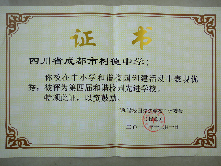 2011年12月2日树德中学参加了全国中小学2011年度安全工作经验交流会暨中国教育学会中小学安全教育与安全管理专业委员会学术年会。在会上树德中学荣获教育部基础教育司颁发的全国“第四届和谐校园先进学校”光荣称号。成都市仅有两所学校获得该殊荣,树德中学还代表四川省获奖学校上台领奖。