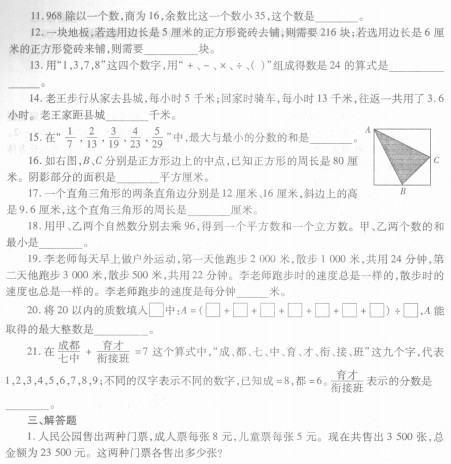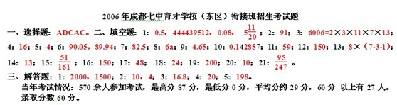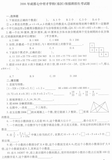 2006年成都七中育才(东区)衔接班招生数学试题(5升6) 家长帮社区 2011-12-23 16:32:16 2006年成都七中育才(东区)衔接班招生数学试题(5升6) 答案: 推荐阅读: 2010成都石室中学小升初奥数试题精编 成都西川中学2009年小升初数学模拟试题(三) 西川中学2009小升初数学模拟试题二