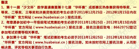 有愿意参加初中一年级组笔试竞赛的考生必须于2011年12月25日-2012年1月15日内在“华杯赛”官方网站报名注册,报名注册后致电:86629752登记参加笔试初赛等相关事项。