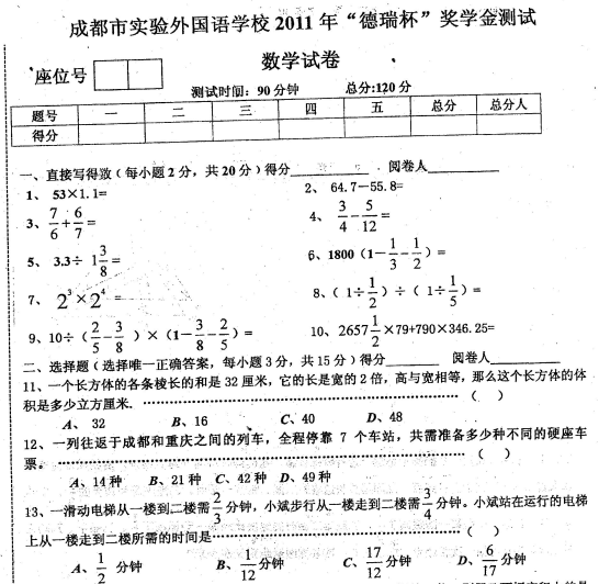 实外2011小升初数学考试真题 QQ群家长提供 2012-02-29 11:06:50 实外2011小升初数学考试真题及答案 请下载附件: 实外2011小升初数学考试真题 本地下载 推荐阅读: 实外2011小升初语文考试真题及答案 2005年七中育才(东区)小升初考试数学试卷 2004年七中育才(东区)小升初考试数学试卷