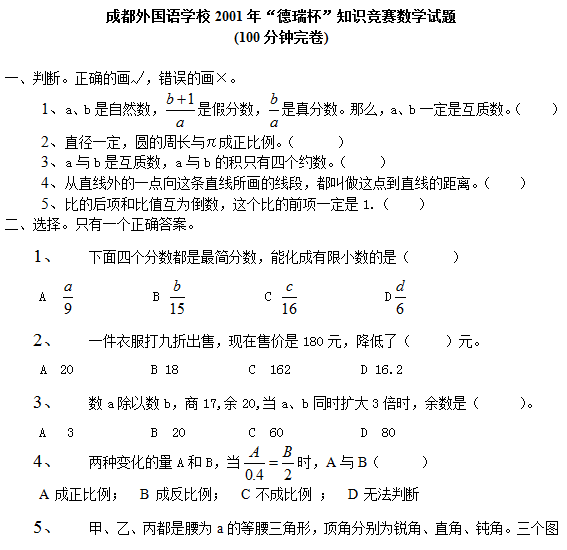 2001年成外小升初“德瑞杯”数学试题 成都奥数网整理 2012-03-08 11:01:49 请下载附件: 成都外国语学校2001小升初“德瑞杯”知识竞赛数学试题 (本地下载 点击在线阅读New! 查看答案)