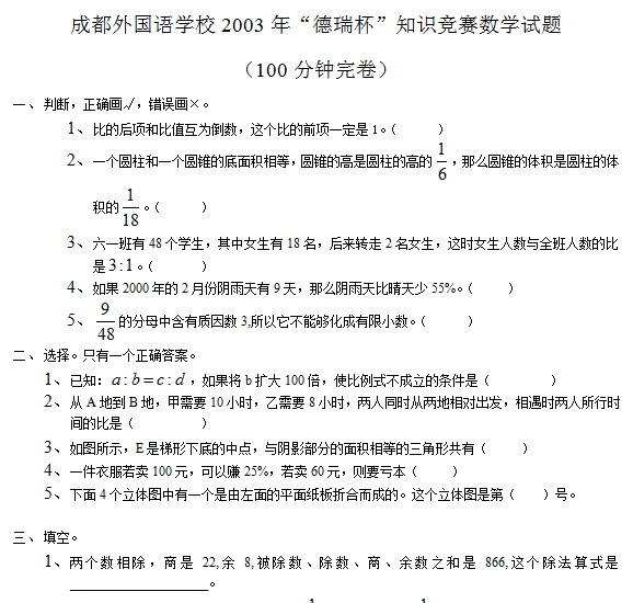 2003年成外小升初“德瑞杯”数学试题 成都奥数网整理 2012-03-08 11:56:06 请下载附件: 成都外国语学校2003小升初“德瑞杯”知识竞赛数学试题 (本地下载 点击在线阅读New! 查看答案)