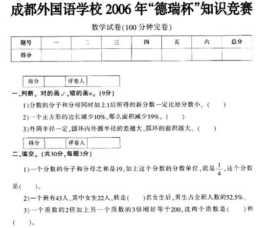 成都外国语学校2006小升初“德瑞杯”知识竞赛数学试题
