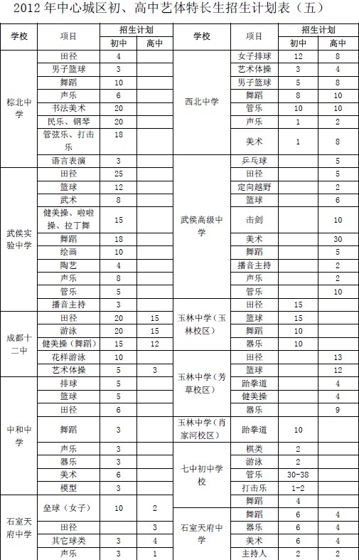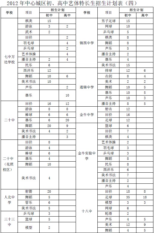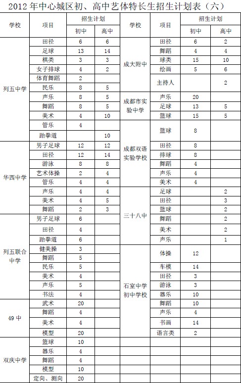 2012年中心城区初、高中艺体特长生招生计划表(2)