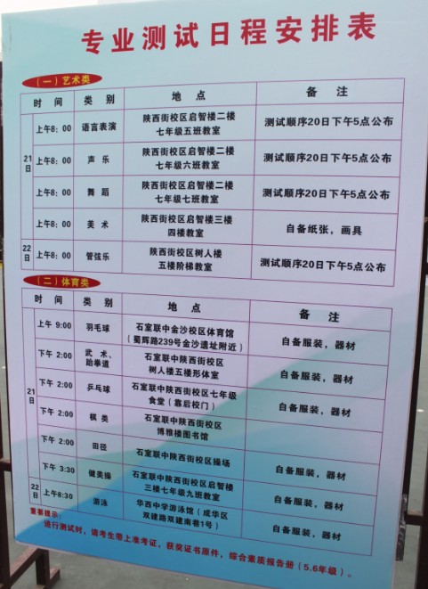 本次报名需要户口本、各种荣誉证书等原件、流水号(还未领取到流水号的同学可电话咨询学校班主任)和毕业证是必不可少的,把资料上交审核通过以后才能提供报名表给家长进行填写,报名成功后即可参加学校测试,具体测试时间和注意事项请查看下图日程安排表。