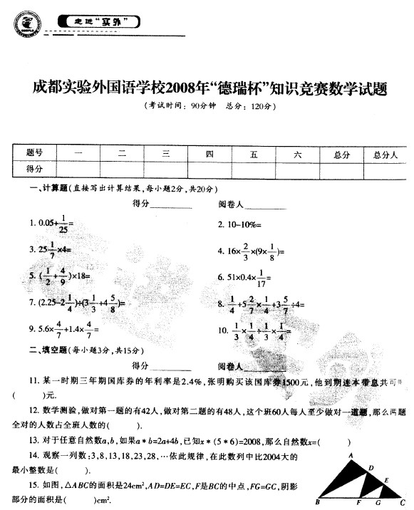 成都奥数网9月14日 走进实外2008年成都实验外国语学校小升初“德瑞杯”知识竞赛数学试题,考试时间90分钟,满分120分。