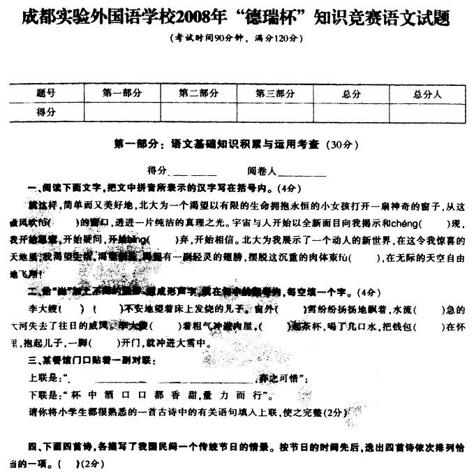| 2008年成都实验外国语学校(实外)小升初语文真题 |