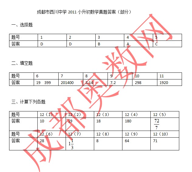 成都奥数网11月2日 2013成都小升初即将打响,西川中学的小升初考试基本是在每年的五一节进行,为帮助更多心仪西川的家长同学们了解西川中学,以下是家长们收集的2011年成都市西川中学小升初数学真题答案,请大家查阅。