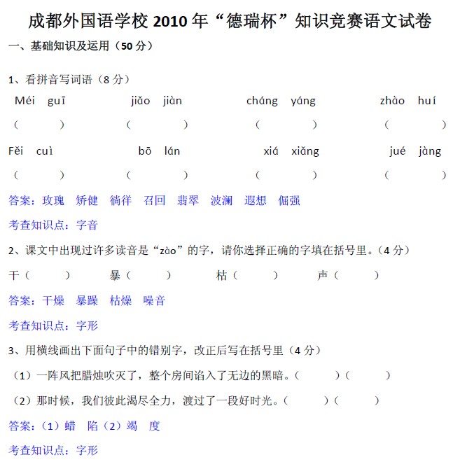 成都奥数网12月19日 成都外国语学校是德瑞教育集团创办的私立一类名校,于每年的4月份进行小升初招生考试报名,每年的五一节前后进行小升初测试,通过过后立即报名入学。以下是成都外国语学校2010年小升初考试语文真题详解,由学而思智康一对一丁子原老师提供。供大家参考。
