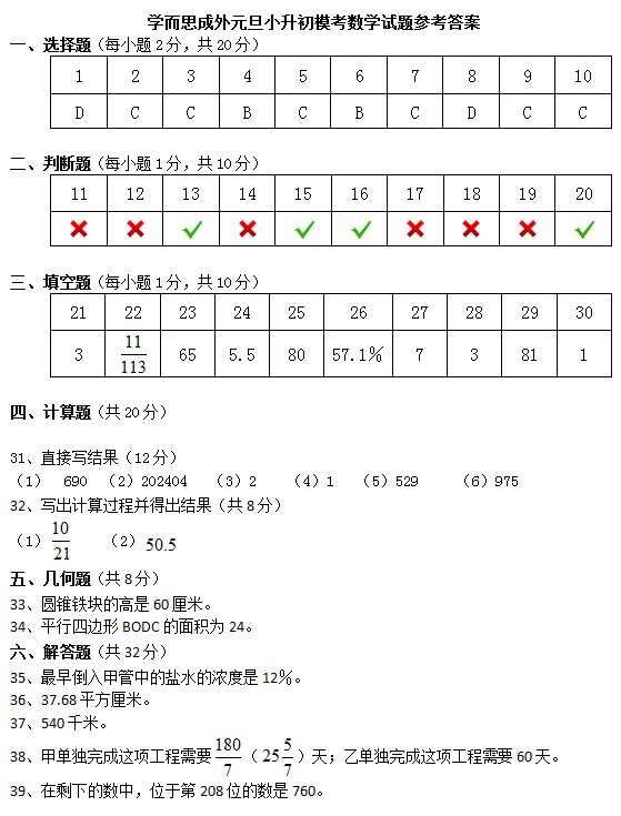 元旦模拟考 成外小升初数学模考答案