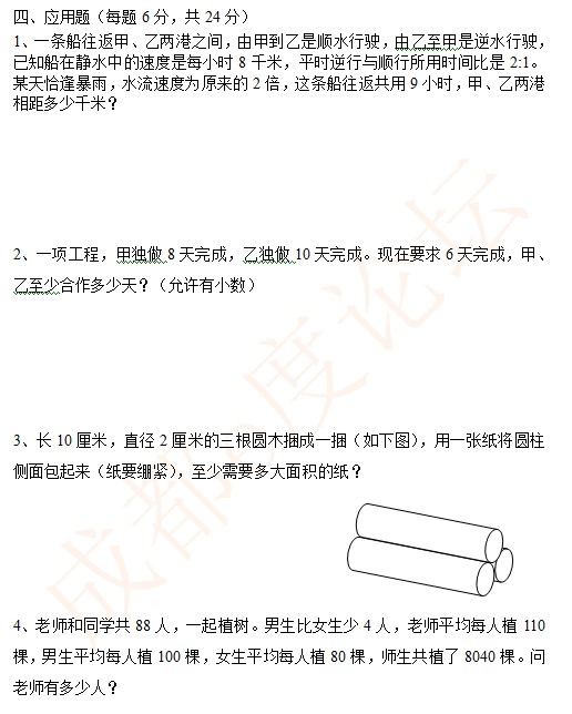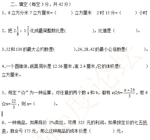 成都奥数网1月6日 新都一中实验学校是新都一所全日制寄宿学校,学校诞生于2004年7月,占地面积69970平方米。建筑面积35000平方米。学校办学规模逐年扩大,从第一年的10个教学班、482名学生、 93名教职工到现有的50个教学班,2536名学生,254名教职员工。每年的小升初,新都一中实验学校都将进行小升初招生考试,以下是2012年新都一中实验学校小升初数学招生考试题。考试时间90分钟,满分120分。供大家参考。