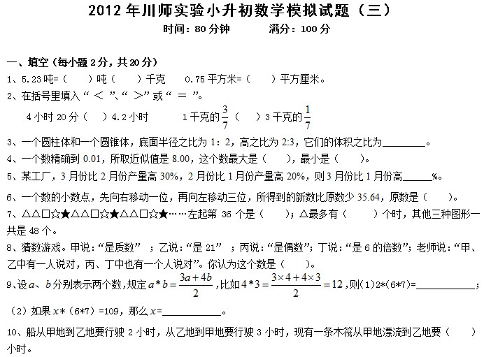 | 川师附属实验2012小升初数学模拟题三 |