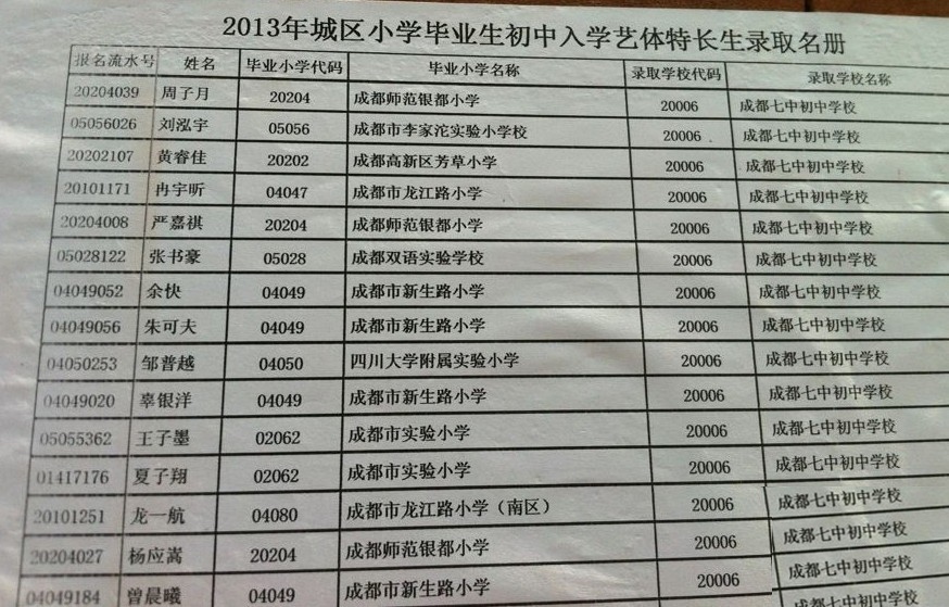 成都七中初中2013艺体特长生名单 家长帮社区 2013-06-27 10:57:05 成都奥数网2013年6月27日 成都七中初中2013艺体特长生名单,共计48人。 推荐阅读: 2013小升初家长走进七中初中有感 成都七中初中2013小升初入学指导手册 2013小升初家长实地走访七初感言