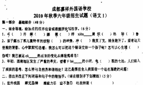 | 《成都嘉祥外国语学校2010年秋季六年级招生试题(语文)》 |
