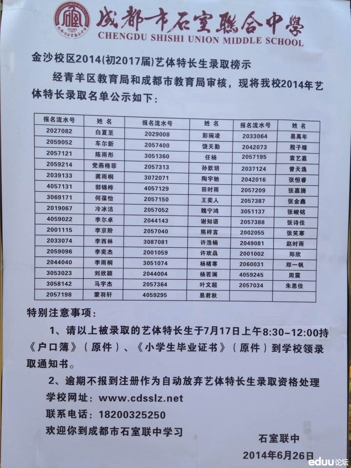 2014小升初石室联合中学特长录取名单公告 家长帮社区 2014-06-26 18:32:55 成都奥数网:下面是小编分享的关于2014小升初石室联合中学特长录取名单公告。 【查看原帖并参与讨论:2014小升初石室联合中学特长录取名单公告】