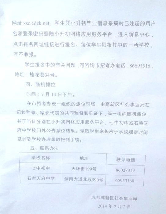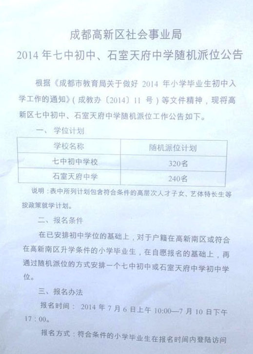 2014成都第四批划片随机派位入学家长须知