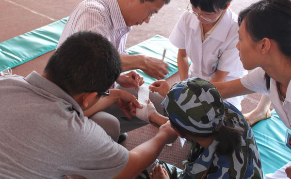 中暑:中暑以后首先要停止训练,迅速脱离高热环境,将其移至通风好的荫凉地方,解开衣扣,让病人平卧,用冷水毛巾敷其头部,扇扇,并给他饮用清凉饮料。如果症状得到缓解就可以归队训练。如果症状不能缓解,要及时送往医院。