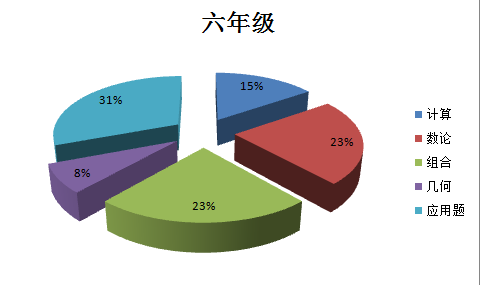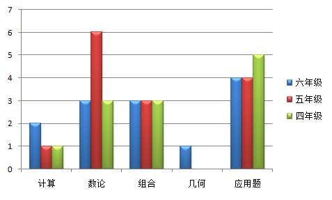 由图一可知,少文杯四、五、六年级的考查知识点变化不大,其中数论、应用题和组合题是13届成都少文杯考查的重点,几何问题几乎不是少文杯考查的重点。预计今年的少文杯考查重点不会有非常大的变动。