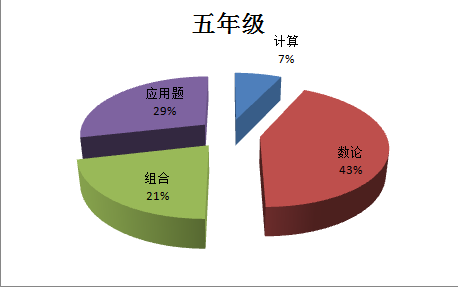 由图三可知,数论是五年级少文杯试题的考察重点占比达到了43%,并且第十三届少文杯五年级题目数量是14道,比六年级多一道题。
