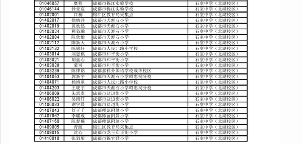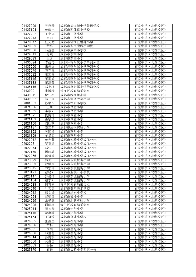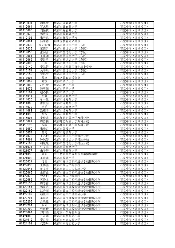 2015成都小升初第三批次确定学位的学校资格审查今日结束,根据规定,市招考办结合艺体特长生和民办学校的录取情况对学生报名资格进行了审查,现将符合成都石室北湖2015小升初随机派位条件的学生名单予以公布。