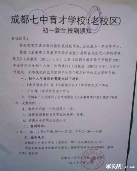 2015成都小升初第四批次随机派位录取工作已经结束了,各初中学校录取发布2015成都小升初新生入学报到公告,下面是成都七中育才学校老校区的2015年小升初微机派位学生报到公告。