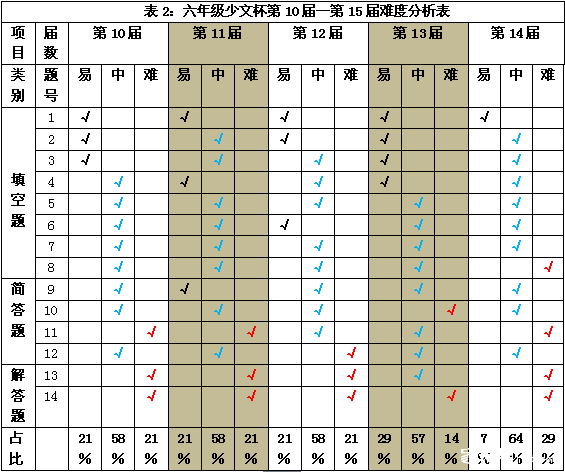 3)第10—12年难易程度基本一致,第13届难度有所降低,第14届的难度有所回升,其主要原因在简单题目减少,杂题部分难度加大了。