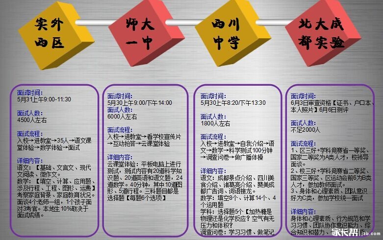 今年成都私立初中学校招生首次采用面试的形式,那么对于2016成都小升初择校目标是成实嘉西师等私立名校的家长和考生应该从现在起就了解各校的小升初面试形式啦。