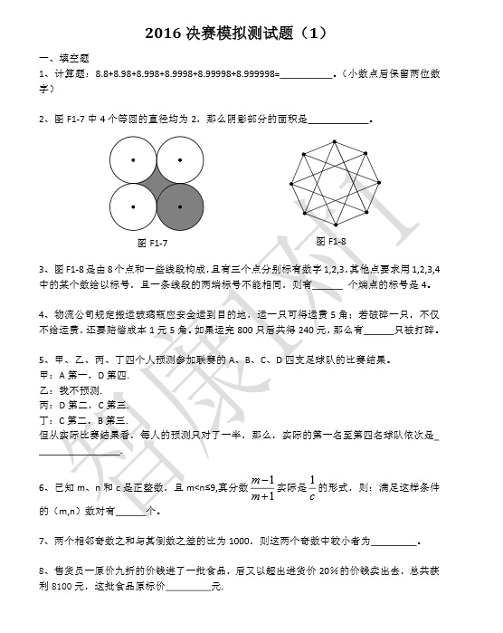 成都赛区第21届华杯赛初赛刚过,华杯赛决赛的模拟试卷又新鲜出炉了,下面奥数网小编将成都智康老师分享的2016年华杯赛决赛模拟试卷1转发如下,供成都赛区华杯赛参赛考生参考。