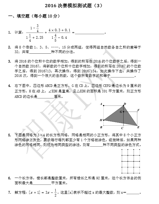成都赛区第21届华杯赛初赛刚过,华杯赛决赛的模拟试卷又新鲜出炉了,下面奥数网小编将成都智康老师分享的2016年华杯赛决赛模拟试卷3转发如下,供成都赛区华杯赛参赛考生参考。