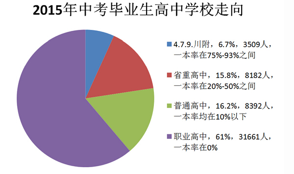 2015年5万中考报名人数中只有2万人合计占39%的孩子能上普通高中,而普通高中学校与重点高中,在教学质量的差别是巨大的,