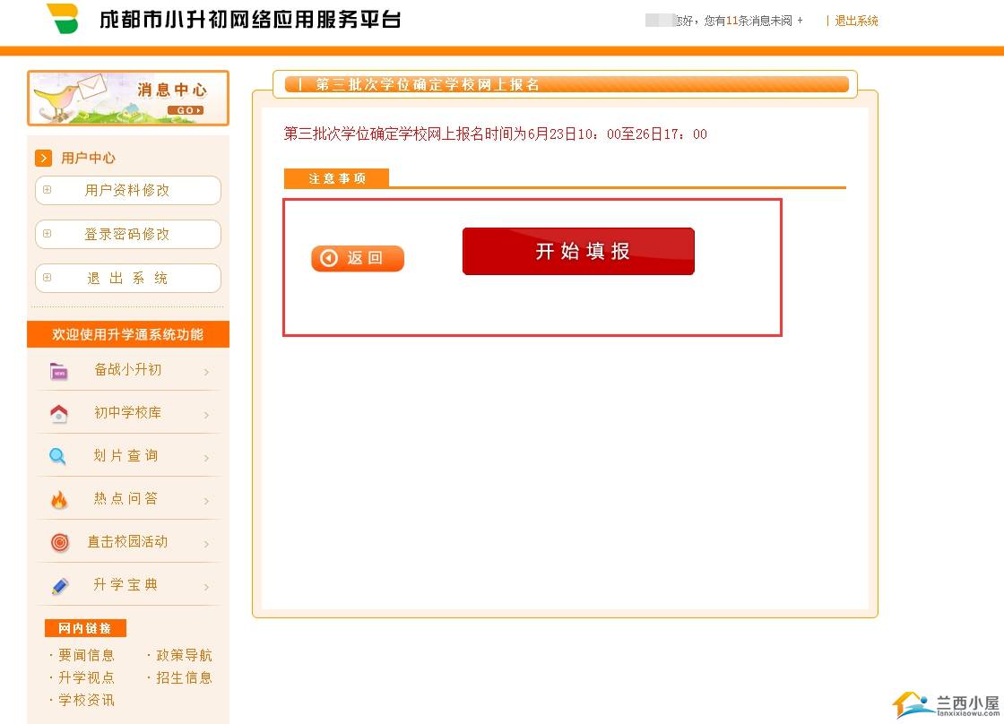 使用注册用户名(18位身份证号)登录小升初网络应用服务平台。点击下一步”后点击“第三批次学位确定学校网上报名”,点击“进入”,进入“开始填报”页面。
