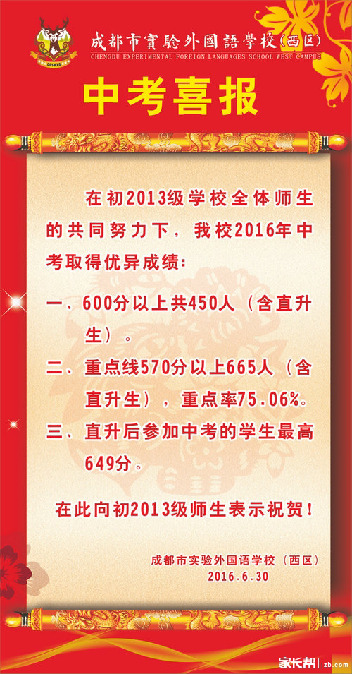 2016年成都各初中学校的中考成绩陆续出炉了,成都家长帮开始征集各初中学校的中考喜报,供成都小升初家长参考各初中学校的中考成绩择校。下面一起来成都实验外国语学校西区(实外西区)今年的中考喜报。