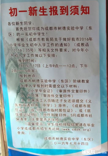 成都树德实验中学东区2016年小升初新生(新初一)报到公告发布,下面是成都树德实验中学2016年小升初新生入学报到须知,供参考。