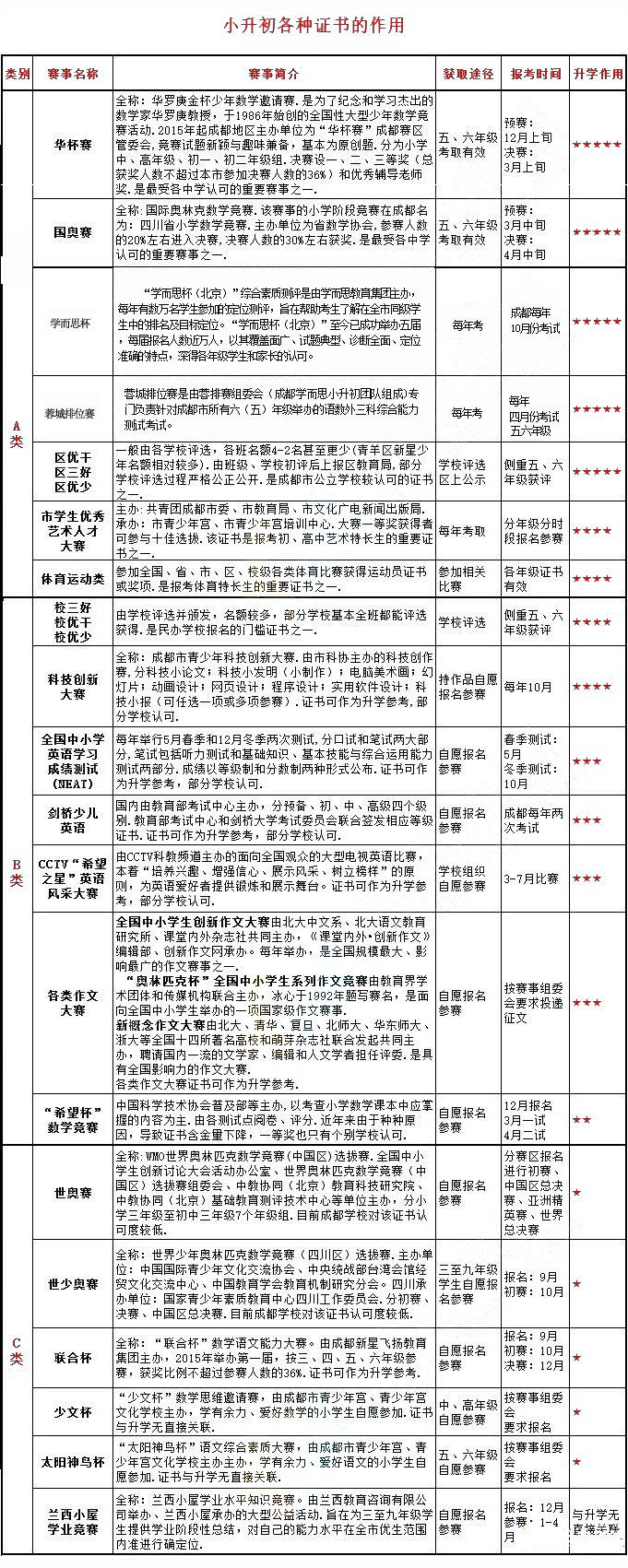 2017年成都小升初择校各种杯赛证书的作用,学生每年都会面临很多竞赛比赛,哪些比赛“有用”而哪些竞赛又是必须上场的呢?很多家长是迷糊的,盲目跟风参赛的、信息不畅或因家长关注度不够而漏报误报捶胸叹息的都有……