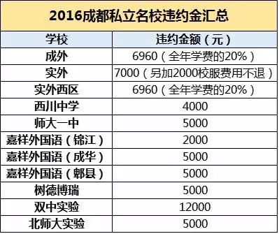 不同学校,违约金金额不一样。低的有嘉祥外国语锦江校区,高的有双中实验,高达12000元。就嘉祥外国语一所学校而言,三个校区违约金都不一样,锦江校区为2000元,成华、郫县两校区为5000元。为什么会这样?一位家长猜测,“谁考上嘉祥锦江会退学?违约金收多少应该跟学校本身的吸引力有很大关系。”
