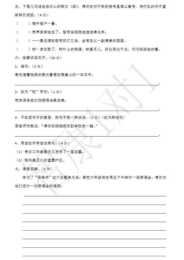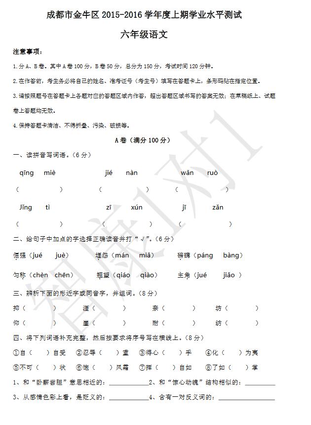 2016-2017学年成都六年级的调考即将开始了,众所周知,成都金牛区的部分公办初中会凭调考成绩小升初招生的。那么下面分享一下成都金牛区2015-2016学年六年级调考语文试卷,供2017成都小升初择校家长参考。