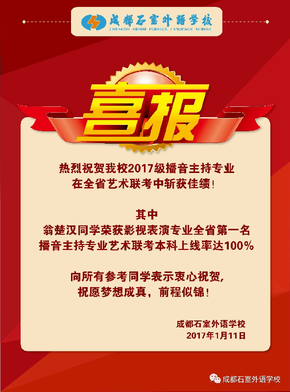 下面是2017年成都石室外国语学校艺考成绩喜报,祝贺翁楚汉同学荣获全省第一名!祝贺全体艺考同学!