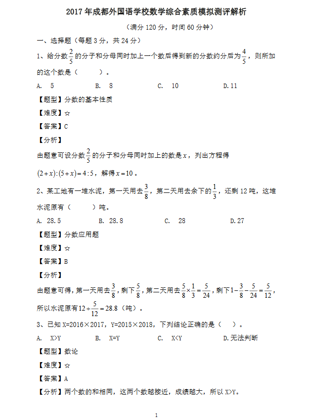 2017成都外国语学校小升初模拟考数学试卷答案