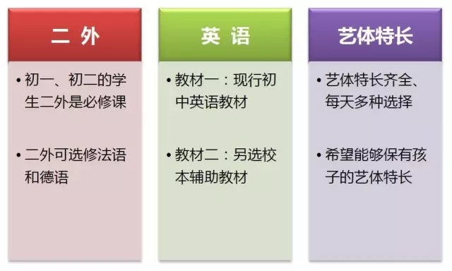二外:初一、初二的学生二外是必修课,二外可选法语和德语;