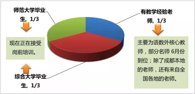 这个是每位家长最关心的问题,现场了解到,所有老师都为专职教师,1/3左右的老师是有教学经验的老师,而且是语数外的核心教师,部分名师要6月份才能到位,除了成都本地的老师,其他老师来自全国各地。1/3左右的老师为综合性大学毕业生;1/3左右的老师为师范类大学硕士以上学历毕业生,新老师现在正在接受岗前培训。