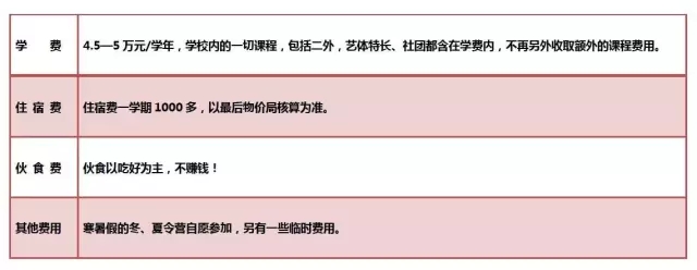 每年学费4.5万—5万,学校内的一切课程,包括二外,艺体特长课都含在学费内,不再另外收取额外的课程费用;外出实践和寒暑假的冬夏令营费用单独计算;伙食费、住宿费另外收取。伙食以吃好为主,不赚钱!住宿费一学期1000多,以最后物价局核算为准。