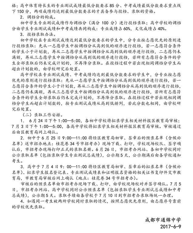 2017年成都通锦中学初、高中艺体特长生招生方案(3) 成都家长帮 2017-06-12 14:39:42 编辑推荐: 2017成都初、高中艺体特长生招生工作有关事宜通知 2017年成都初、高中艺体特长生招生工作图解 2017成都市中心城区普通高中招收艺体特长生网报须知 首页 上一页 下一页 尾页