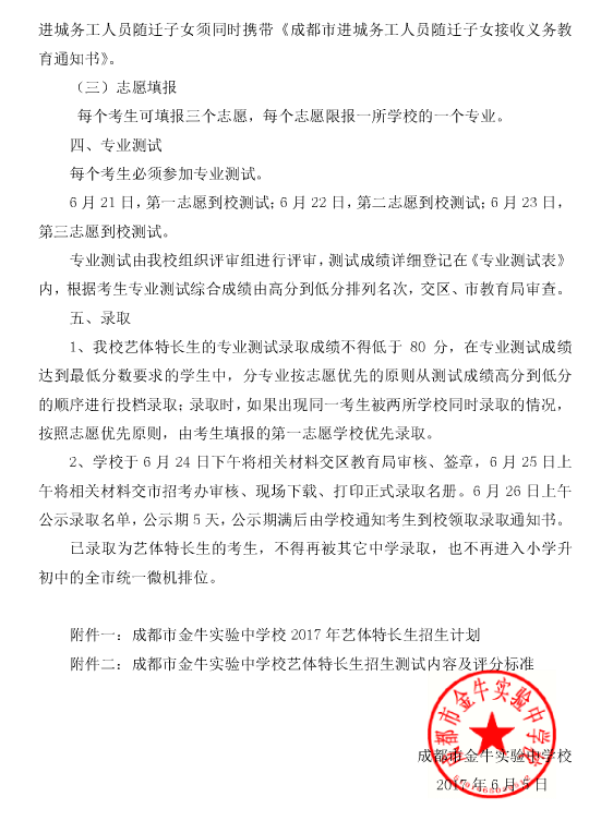 2017年成都金牛实验中学小升初艺体招生公告(3) 成都家长帮 2017-06-12 15:16:42 附件: 1、2017年成都金牛实验中学小升初艺体招生计划 2、2017年成都金牛实验中学小升初艺体特长生测试内容 编辑推荐: 2017成都初、高中艺体特长生招生工作有关事宜通知 2017年成都初、高中艺体特长生招生工作图解 2017成都市中心城区普通高中招收艺体特长生网报须知 首页 上一页 下一页 尾页