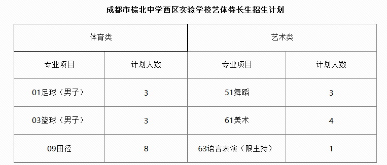 2017年成都棕北中学西区实验学校艺体特长生招生方案